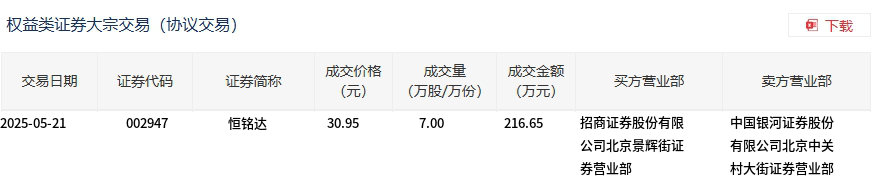 恒铭达今日大宗交易折价成交7万股,成交额216.65万元