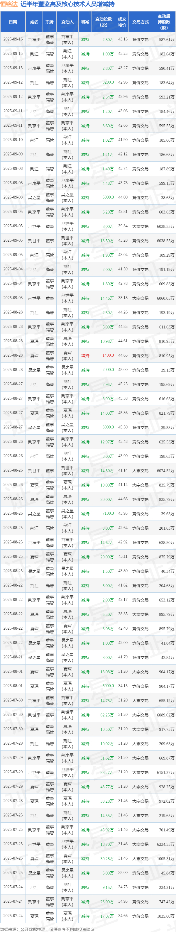 恒铭达近半年内的董监高及核心技术人员增减持详情如下: