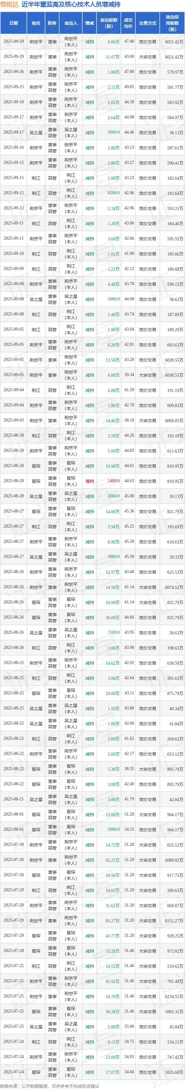 恒铭达近半年内的董监高及核心技术人员增减持详情如下:
