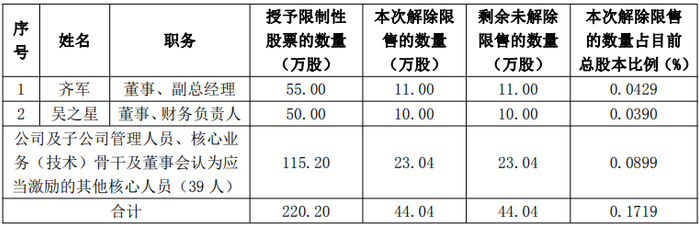 本次符合解除限售条件的激励对象为41人,可解除限售的限制性股票数量为44万股,占公司总股本2.56亿股的0.1719%。解除限售股份的上市流通日期为2025年12月8日。具体情况如下: