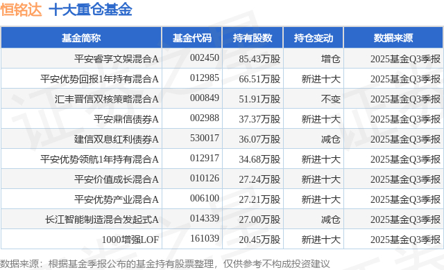 重仓恒铭达的前十大公募基金请见下表: