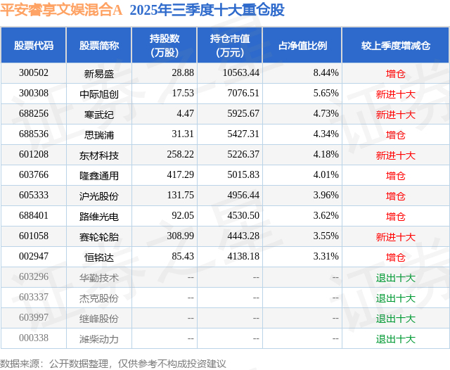 平安睿享文娱混合A的前十大重仓股如下: