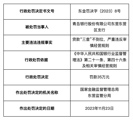 贷款“三查”不到位,青岛银行东营东营区支行被罚35万
