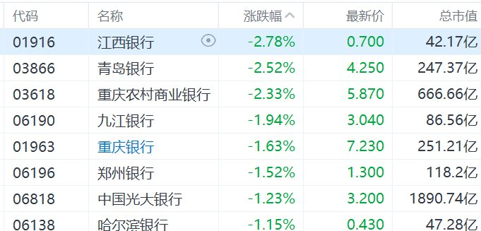 港股内银股普跌,江西银行、青岛银行跌超2%