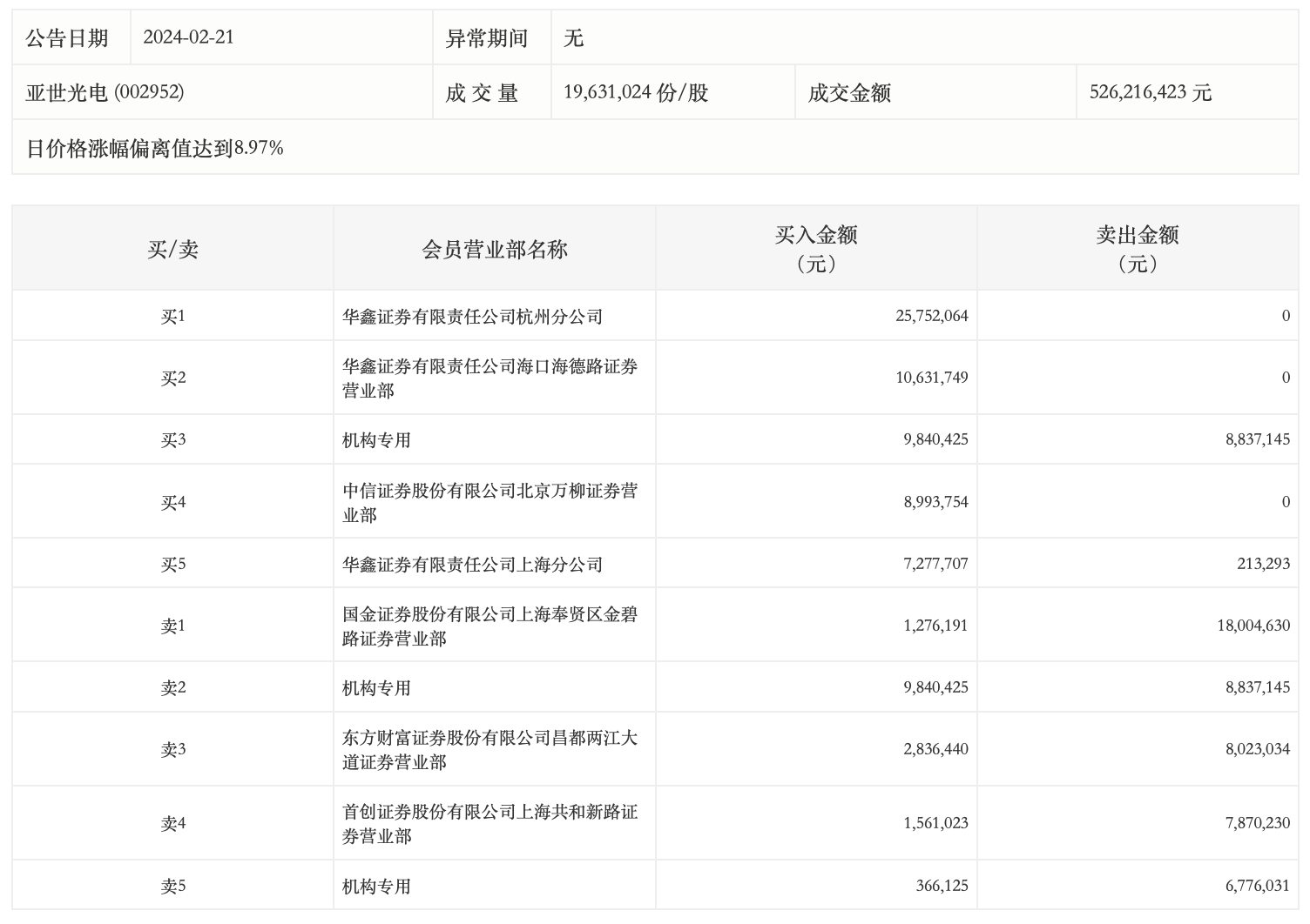2月21日,亚世光电今日涨停,龙虎榜数据显示,上榜营业部席位全天成交1.18亿元,占当日总成交金额比例为22.47%。其中,买入金额为6853.55万元,卖出金额为4972.44万元,合计净买入1881.11万元。