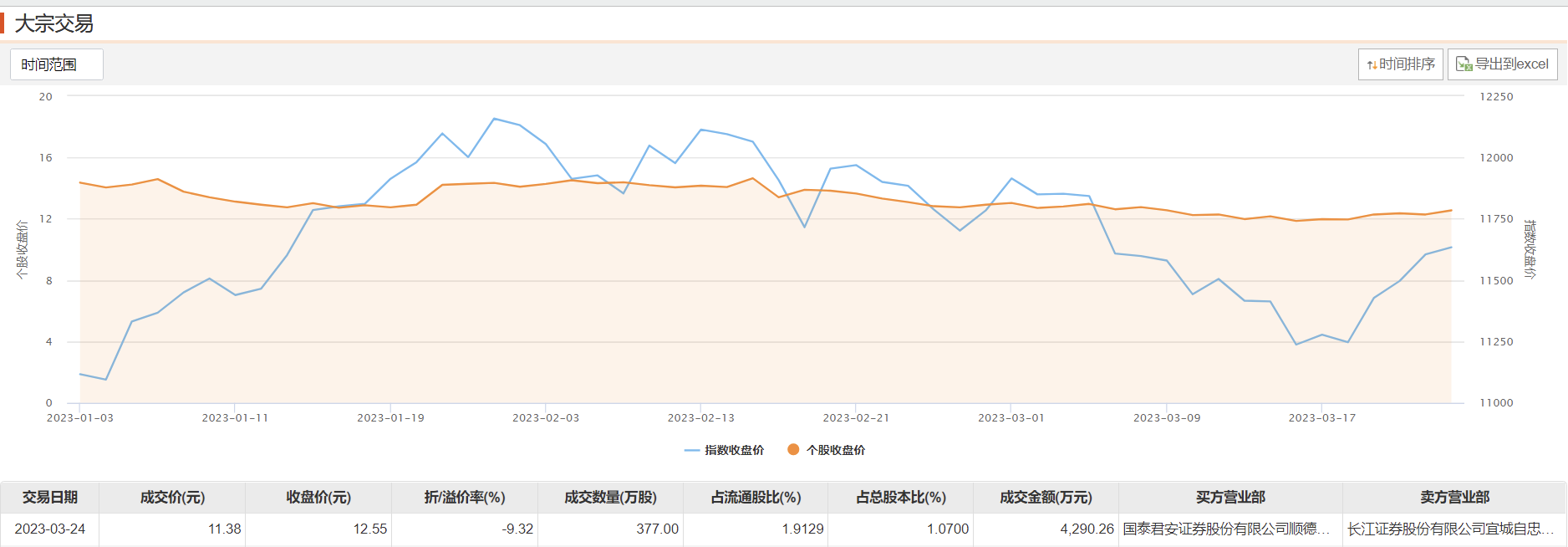 大宗交易成交377万股,成交额4290.26万元,占当日总成交额的33.13%,成交价11.38元,较市场收盘价12.55元折价9.32%。