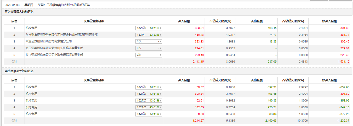 具体来看,机构买入1214.27万元,卖出2450.63万元,合计净卖出1236.37万元。此外,东方财富证券拉萨金融城南环路证券营业部、兴业证券内蒙古分公司分别卖出74.77万元、13.83万元;东方财富证券拉萨金融城南环路证券营业部、兴业证券内蒙古分公司分别买入456.48万元、323.33万元。