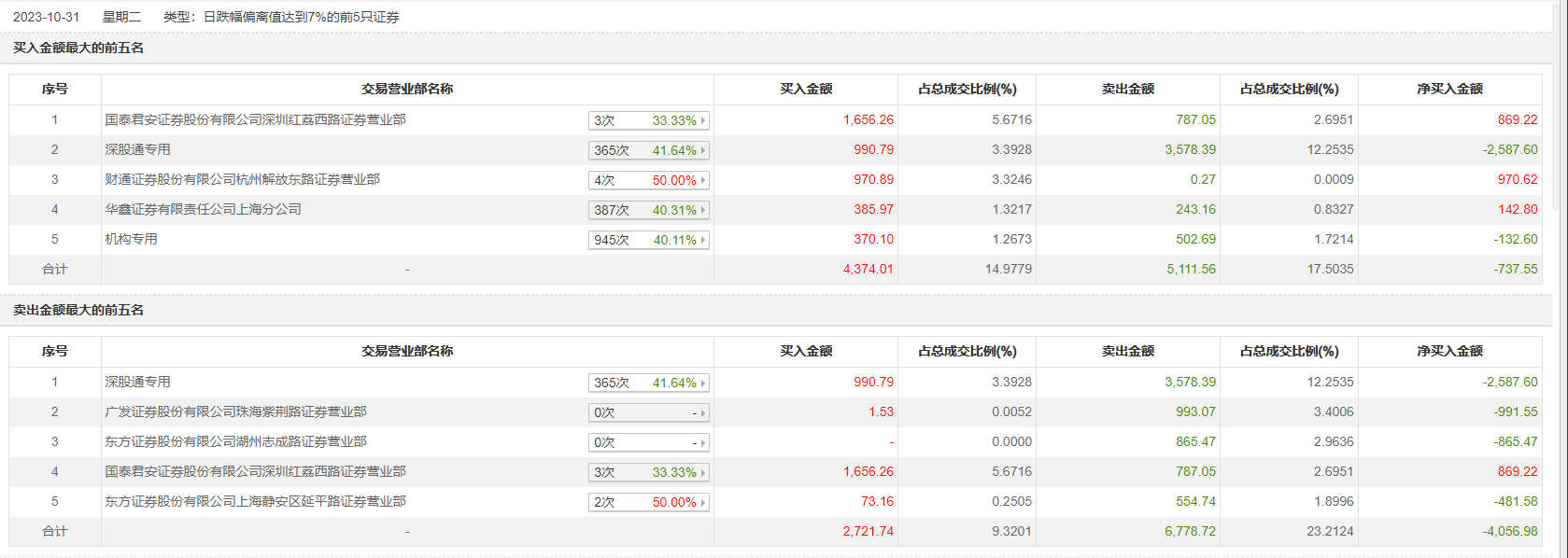 10月31日,鸿合科技今日跌停,全天换手率达6.06%,振幅达8.02%。龙虎榜数据显示,营业部席位合计净卖出3076.15万元。其中,机构买入370.1万元,卖出502.69万元,合计净卖出132.6万元。此外,深股通专用、广发证券珠海紫荆路证券营业部分别卖出3578.39万元、993.07万元;国泰君安证券深圳红荔西路证券营业部、深股通专用分别买入1656.26万元、990.79万元。