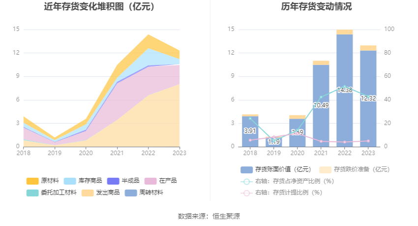 从存货变动来看,截至2023年年末,公司存货账面价值为12.32亿元,占净资产的42.95%,较上年末减少2.07亿元。其中,存货跌价准备为6504.32万元,计提比例为5.02%。