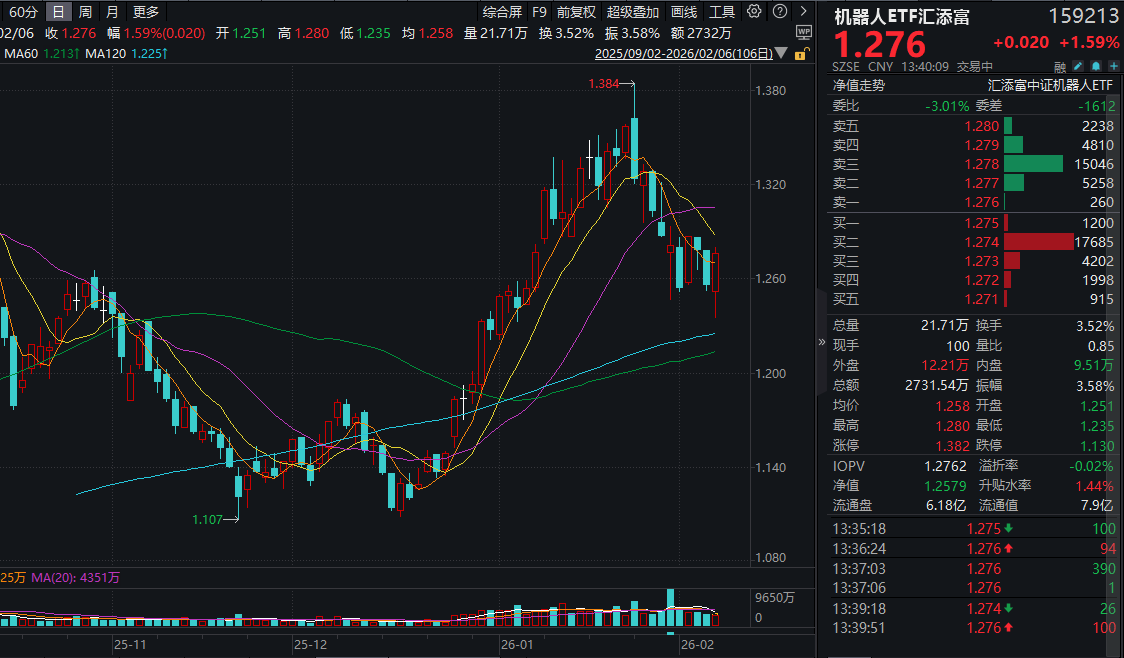 今日(2.6),A股走出低开高走的独立行情,机器人板块探底回升走强!机器人ETF汇添富(159213)涨近2%,盘中成交额放量至2700万元!
