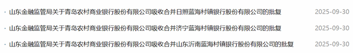 瑞财经 王敏9月30日,山东金融监管局今日发布两则批复,同意青岛农村商业银行股份有限公司(以下简称“青农商行”)吸收合并济宁蓝海村镇银行股份有限公司、山东沂南蓝海村镇银行股份有限公司、日照蓝海村镇银行股份有限公司。
