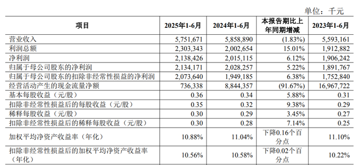 2025年上半年,青农商行实现营业收入57.52亿元,同比下降1.83%;归属于母公司股东的净利润21.34亿元,同比增加1.06亿元,增幅5.22%。