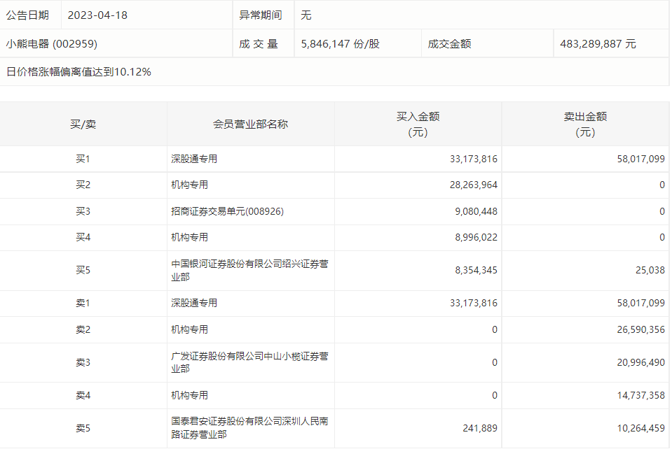 4月18日,小熊电器今日涨停,龙虎榜数据显示,上榜营业部席位全天成交2.19亿元,占当日总成交金额比例为45.26%。其中,买入金额为8811.05万元,卖出金额为1.31亿元,合计净卖出4252.03万元。