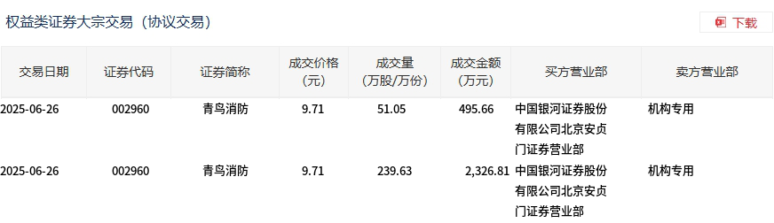 青鸟消防今日大宗交易平价成交290.68万股,成交额2822.47万元