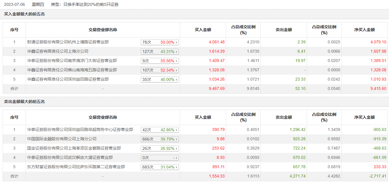 具体来看,财通证券杭州上塘路证券营业部、华鑫证券上海分公司分别买入4081.48万元、1614.39万元;华泰证券深圳益田路荣超商务中心证券营业部、中国国际金融上海分公司分别卖出1296.42万元、925.28万元。