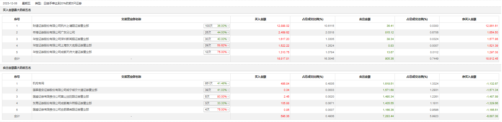 12月8日,五方光电今日涨停,全天换手率达34.69%,振幅达13.83%。龙虎榜数据显示,营业部席位合计净买入1.22亿元。其中,机构买入486.84万元,卖出1619.51万元,合计净卖出1132.67万元。此外,财通证券杭州上塘路证券营业部、申港证券广东分公司分别买入1.29亿元、2469.62万元;国泰君安证券咸宁咸宁大道证券营业部、国盛证券黄山洽阳路证券营业部分别卖出1571.68万元、1490.34万元。
