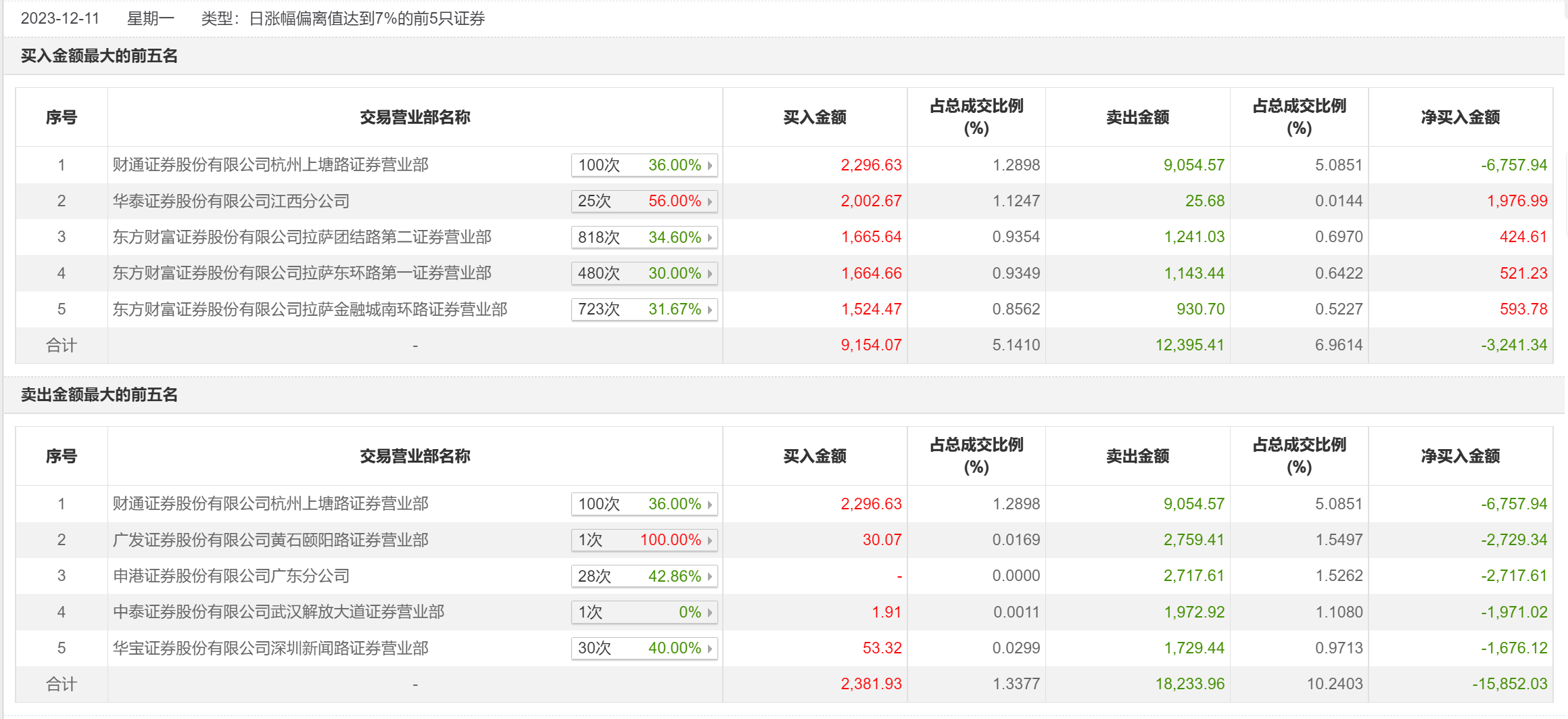 12月11日,五方光电今日涨停,全天换手率达44.58%,振幅达9.83%。龙虎榜数据显示,营业部席位合计净卖出1.23亿元。其中,财通证券杭州上塘路证券营业部、华泰证券江西分公司分别买入2296.63万元、2002.67万元;财通证券杭州上塘路证券营业部、广发证券黄石颐阳路证券营业部分别卖出9054.57万元、2759.41万元。