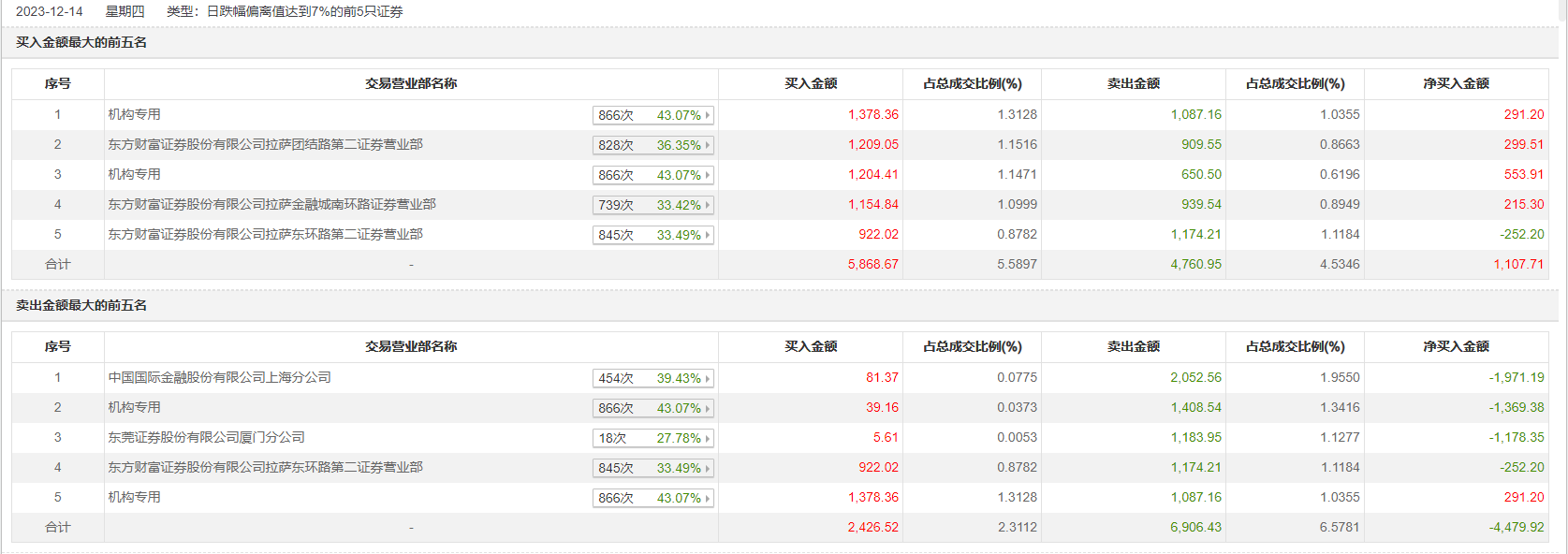 12月14日,五方光电今日跌停,全天换手率达28.29%,振幅达6.68%。龙虎榜数据显示,营业部席位合计净卖出3411.2万元。其中,机构买入2621.93万元,卖出3146.2万元,合计净卖出524.27万元。此外,中国国际金融上海分公司、东莞证券厦门分公司分别卖出2052.56万元、1183.95万元;东方财富证券拉萨团结路第二证券营业部、东方财富证券拉萨金融城南环路证券营业部分别买入1209.05万元、1154.84万元。