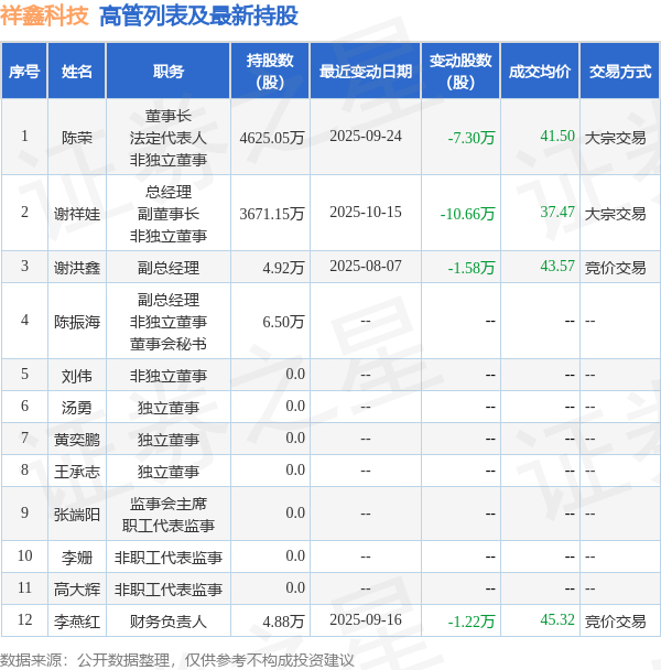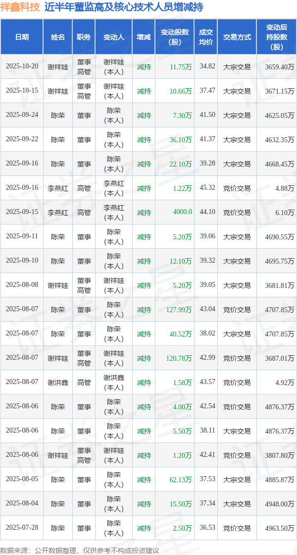 祥鑫科技近半年内的董监高及核心技术人员增减持详情如下: