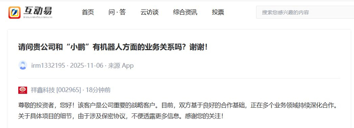 【V观财报丨祥鑫科技:小鹏是公司重要战略客户】近日,有投资者通过深交所互动易平台向祥鑫科技提问:请问贵公司和“小鹏”有机器人方面的业务关系吗?就此,祥鑫科技回复称,该客户是公司重要的战略客户。目前,双方基于良好的合作基础,正在多个业务领域持续深化合作。关于具体项目的细节,由于涉及保密协议,不便透露更多信息。(中新经纬APP)