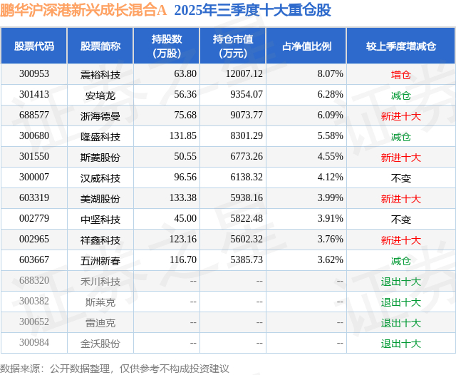 鹏华沪深港新兴成长混合A的前十大重仓股如下: