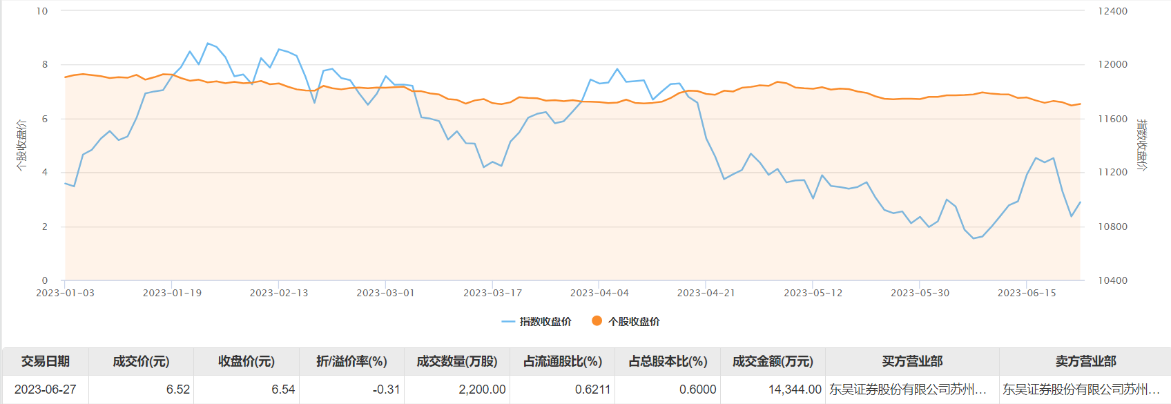6月27日大宗交易成交2200万股,成交额1.43亿元,占当日总成交额的63.95%,成交价6.52元,较市场收盘价6.54元折价0.31%。