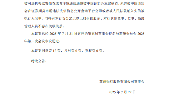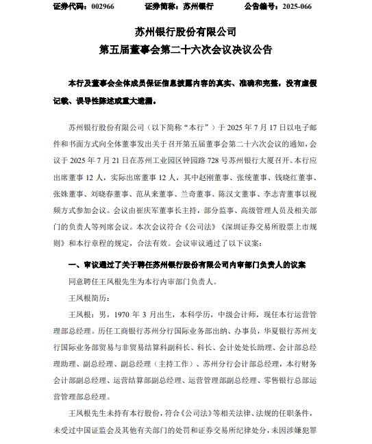 7月22日,苏州银行(002966)发布公告称,该行聘任王凤根先生为本行内审部门负责人。