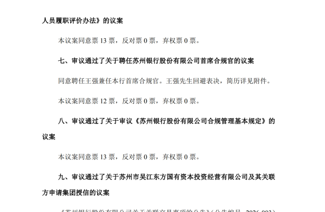 2月10日,苏州银行发布《第五届董事会第三十一次会议决议公告》指出,该行第五届董事会第三十一次会议审议通过了《关于聘任苏州银行股份有限公司首席合规官的议案》,同意聘任王强兼任该行首席合规官。