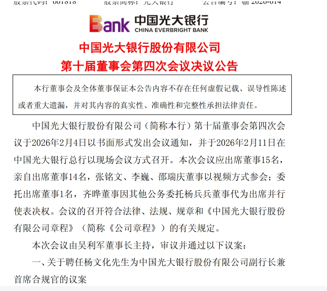 2月11日,光大银行发布公告指出,该行第十届董事会第四次会议审议并通过了《关于聘任杨文化先生为中国光大银行股份有限公司副行长兼首席合规官的议案》,该行董事会同意聘任杨文化为副行长兼首席合规官。杨文化的副行长兼首席合规官职务自其任职资格获国家金融监督管理总局核准之日起生效。