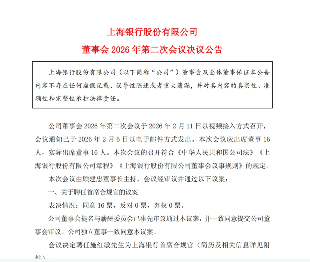 2月11日,上海银行发布董事会2026年第二次会议决议公告,会议决定聘任施红敏为上海银行首席合规官。