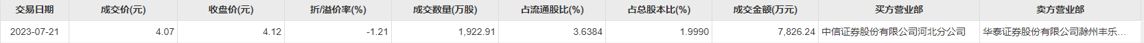 7月21日大宗交易成交1922.91万股,成交额7826.24万元,占当日总成交额的67.26%,成交价4.07元,较市场收盘价4.12元折价1.21%。