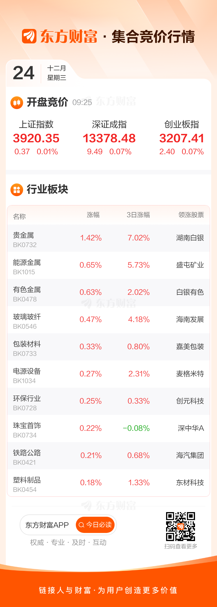 12月24日,三大指数集体高开,上证指数高开0.01%,深证成指高开0.07%,创业板指高开0.07%。板块方面,贵金属领涨,湖南白银涨3.03%,能源金属、有色金属等开盘涨幅居前。