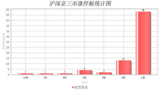 10板共1支,7板共1支,6板共1支,4板共4支,3板共2支,2板共13支,1板共58支,市场当前最高板为10连板!