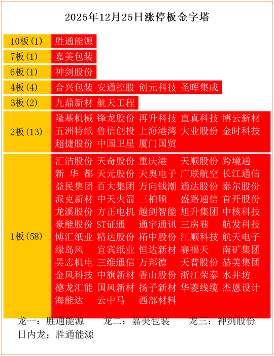 2025年12月25日涨停板连板:胜通能源10连板 嘉美包装7板