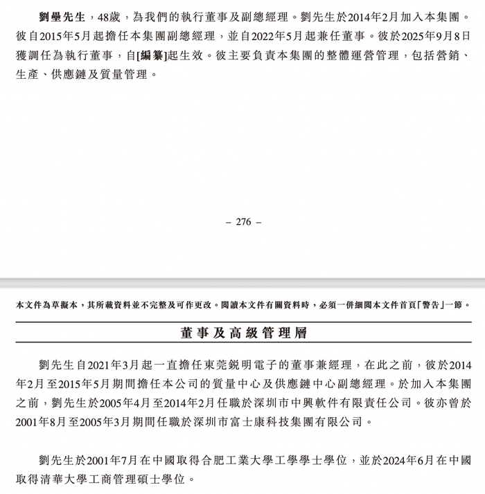 刘垒,48岁,为公司执行董事及副总经理。刘垒于2014年2月加入集团。其自2015年5月起担任集团副总经理,并自2022年5月起兼任董事。其于2025年9月8日获调任为执行董事。其主要负责集团的整体运营管理,包括营销、生产、供应链及质量管理。