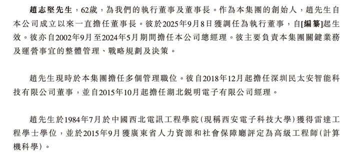 资料显示,赵志坚,62岁,为公司执行董事及董事长。作为集团的创始人,赵志坚自公司成立以来一直担任董事长。其于2025年9月8日获调任为执行董事。其亦自2002年9月至2024年5月期间担任公司总经理。其主要负责集团关键业务及运营事宜的整体管理、战略规划及决策。