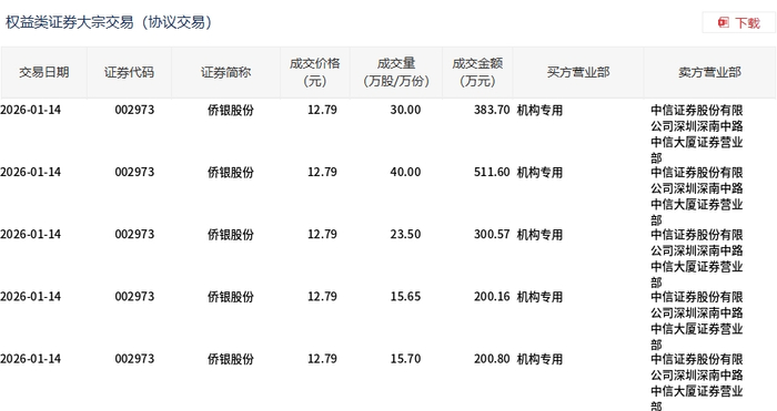 侨银股份今日大宗交易折价成交124.85万股,成交额1596.83万元
