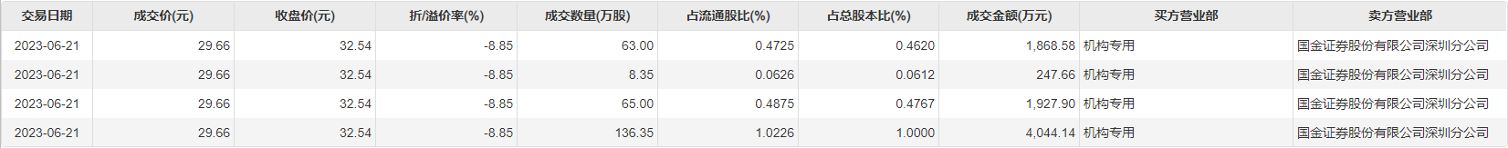 6月21日大宗交易成交272.7万股,成交额8088.28万元,占当日总成交额的80.9%,成交价29.66元,较市场收盘价32.54元折价8.85%。