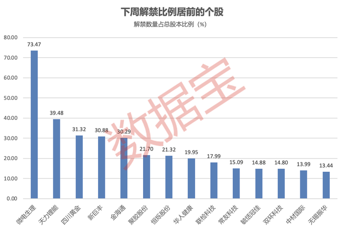 从解禁数量占总股本来看,14股解禁数量占总股本比例超10%,微电生理、天力锂能、四川黄金、新巨丰、金海通解禁占比均超30%,其中微电生理解禁占比超73%,居首。