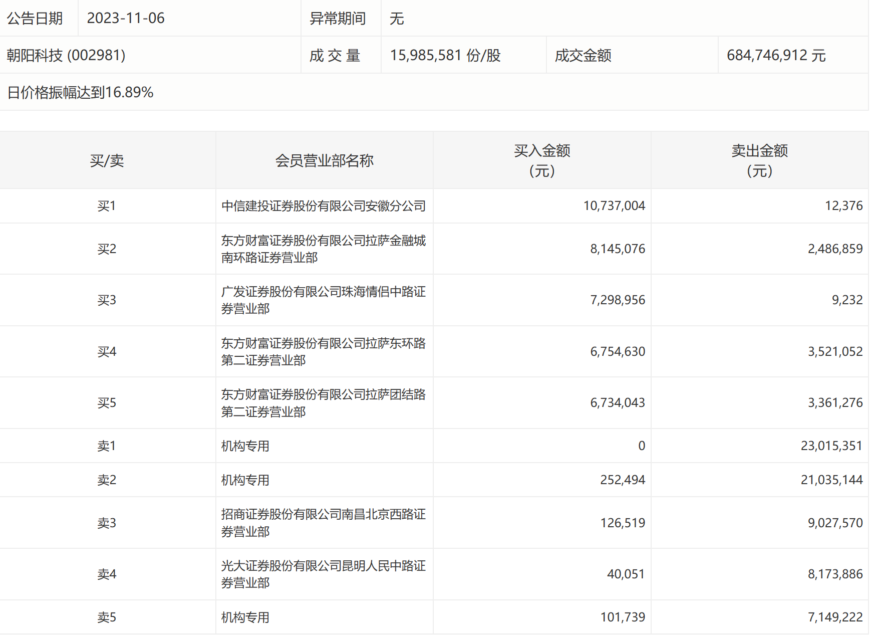 龙虎榜丨朝阳科技今日涨0.79%,三机构净卖出5084.55万元