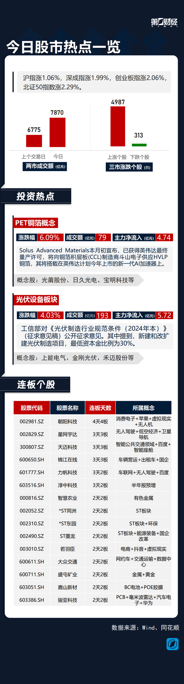 板块方面,PET铜箔概念大涨,Solus Advanced Materials本月初宣布,已获得英伟达最终量产许可,将向铜箔积层板(CCL)制造商斗山电子供应HVLP铜箔,其将搭载在英伟达计划今年上市的新一代AI加速器上。光伏设备板块表现强势,工信部对《光伏制造行业规范条件(2024年本)》(征求意见稿)公开征求意见。其中提到,新建和改扩建光伏制造项目,最低资本金比例为30%。