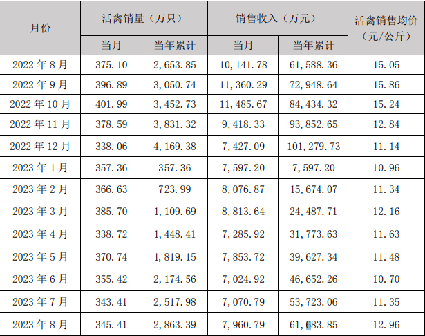 9月7日公告,公司2023年8月份销售活禽345.41万只,销售收入7960.79万元,销售均价12.96元/公斤,环比变动分别为0.58%、12.59%、14.19%,同比变动分别为-7.92%、-21.51%、-13.86%。1月至8月,公司累计销售活禽2863.39万只,累计销售收入6.17亿元。
