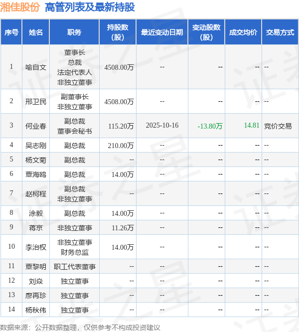 湘佳股份:10月16日高管何业春减持股份合计13.8万股