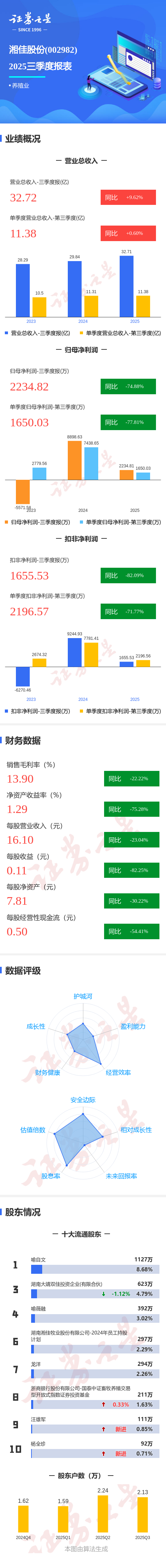 图解湘佳股份三季报:第三季度单季净利润同比下降77.82%