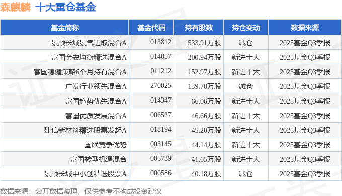 持有森麒麟最多的基金为景顺长城景气进取混合A,目前规模为23.91亿元,最新净值0.8038(10月30日),较上一交易日下跌0.88%,近一年上涨15.03%。该基金现任基金经理为张靖。