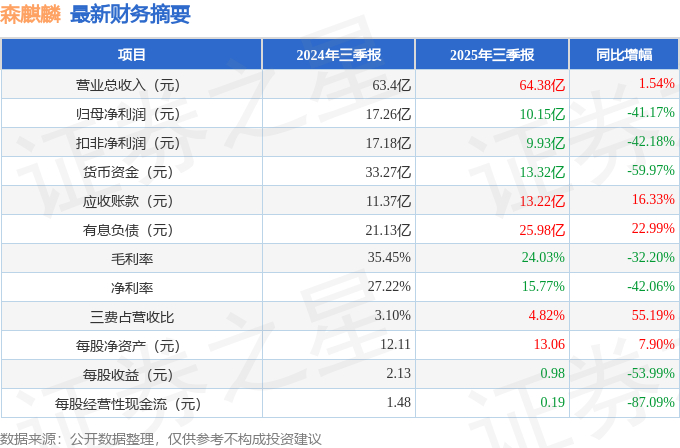据证券之星公开数据整理,近期森麒麟(002984)发布2025年三季报。根据财报显示,森麒麟增收不增利。截至本报告期末,公司营业总收入64.38亿元,同比上升1.54%,归母净利润10.15亿元,同比下降41.17%。按单季度数据看,第三季度营业总收入23.18亿元,同比上升3.94%,第三季度归母净利润3.43亿元,同比下降47.03%。