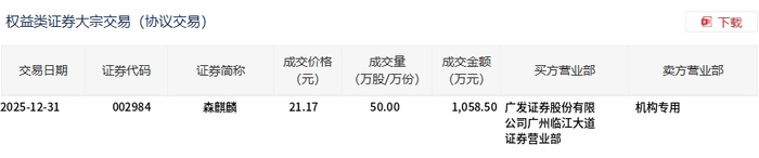 森麒麟今日大宗交易平价成交50万股,成交额1058.5万元