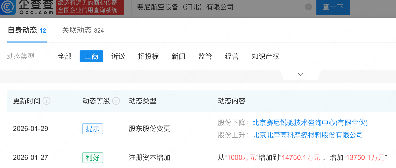 企查查APP显示,近日,赛尼航空设备(河北)有限公司发生工商变更,北摩高科(002985.SZ)持股比例由80%上升至98.64%,同时注册资本由1000万元增至1.48亿元。企查查信息显示,该公司成立于2024年,经营范围包含:民用航空器零部件设计和生产;航天设备制造;航天器及运载火箭制造;特种设备制造等。