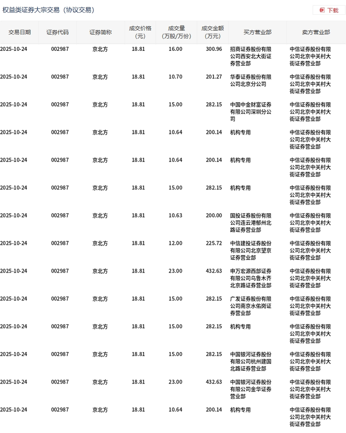 10月24日,京北方大宗交易成交202.25万股,成交额3804.38万元,占当日总成交额的7.03%,成交价18.81元,较市场收盘价21.32元折价11.77%。