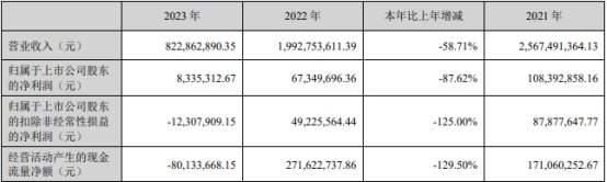 2023年,公司营业收入8.23亿元,同比减少58.71%;归属于上市公司股东的净利润833.53万元,同比减少87.62%;归属于上市公司股东的扣除非经常性损益的净利润-1230.79万元,上年同期为4922.56万元;经营活动产生的现金流量净额-8013.37万元,上年同期为2.72亿元。